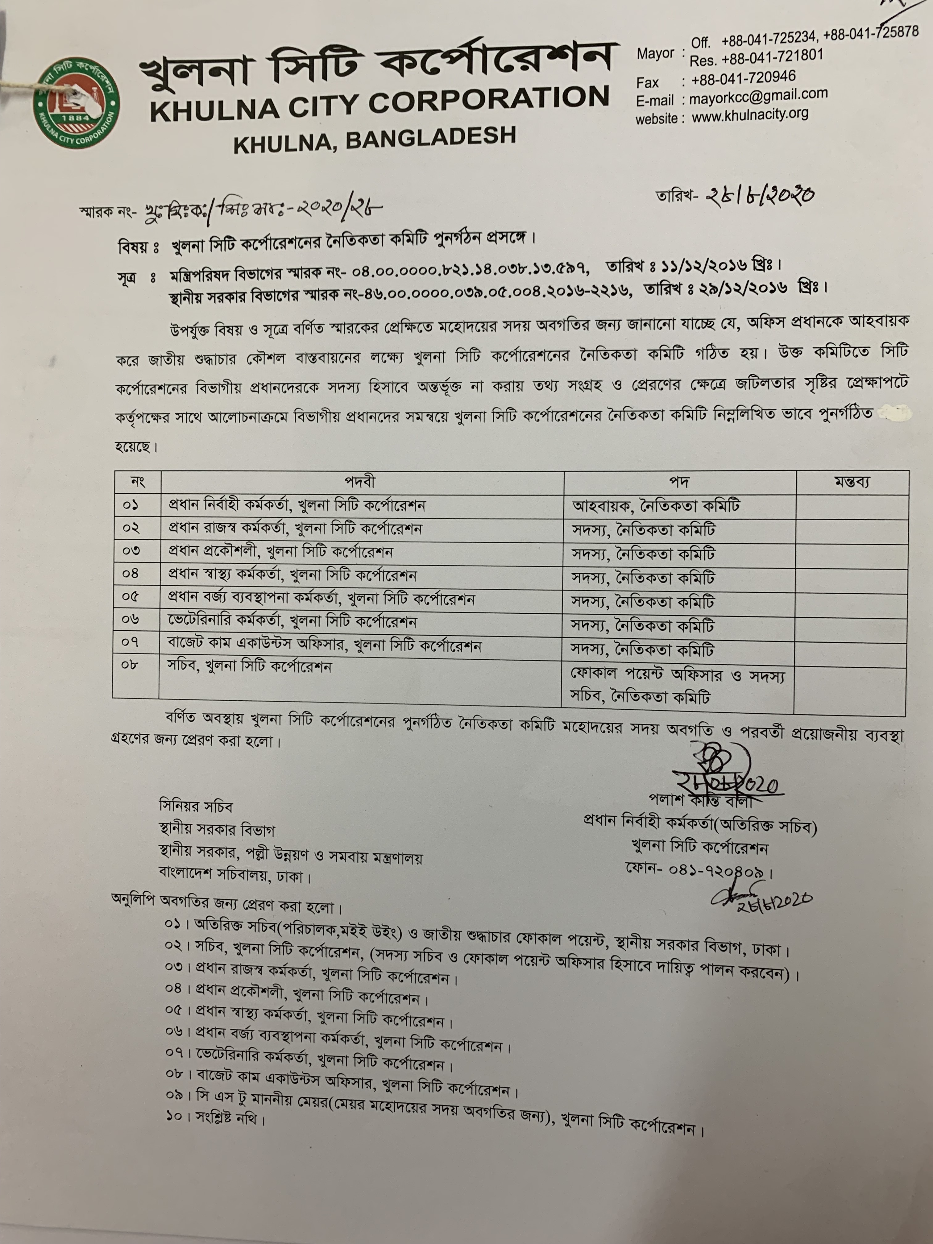 কেসিসি শুদ্ধাচার কৌশল কর্মপরিকল্পনা নৈতিকতা কমিটি পুনর্গঠন